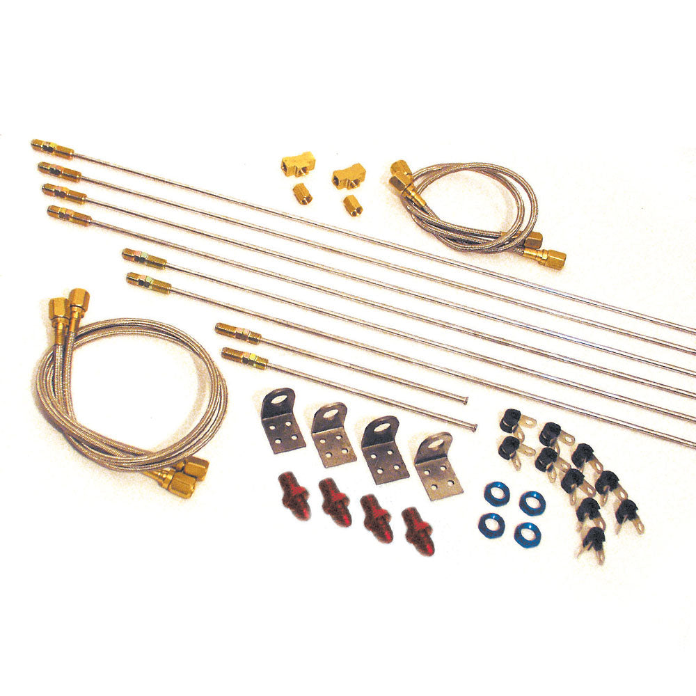 Includes 4 SS braided lines to go from the chassis to the wheels, an assortment of pre-flared bendable steel chassis lines, connectors, fittings, frame tabs, Adel clamps, wire ties. Enough parts to do almost any car from a midget to a Sprint Cup car (order caliper fittings separately).