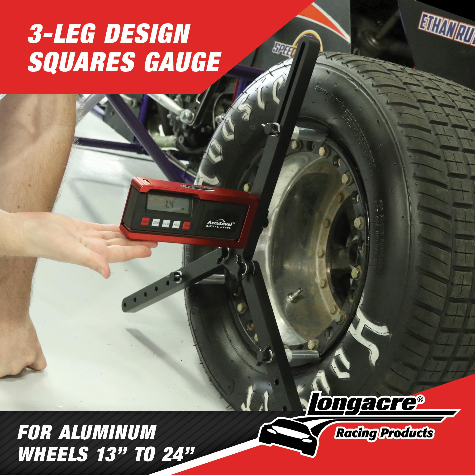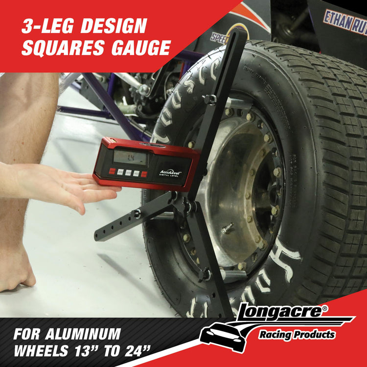 This is the fastest way to check your front end alignment. Just hold it against the rim for easy, accurate readings. No spindle adapters required here. Billet aluminum fully CNC machined. Rigid for accurate readings. Three-leg design squares gauge to your wheel.