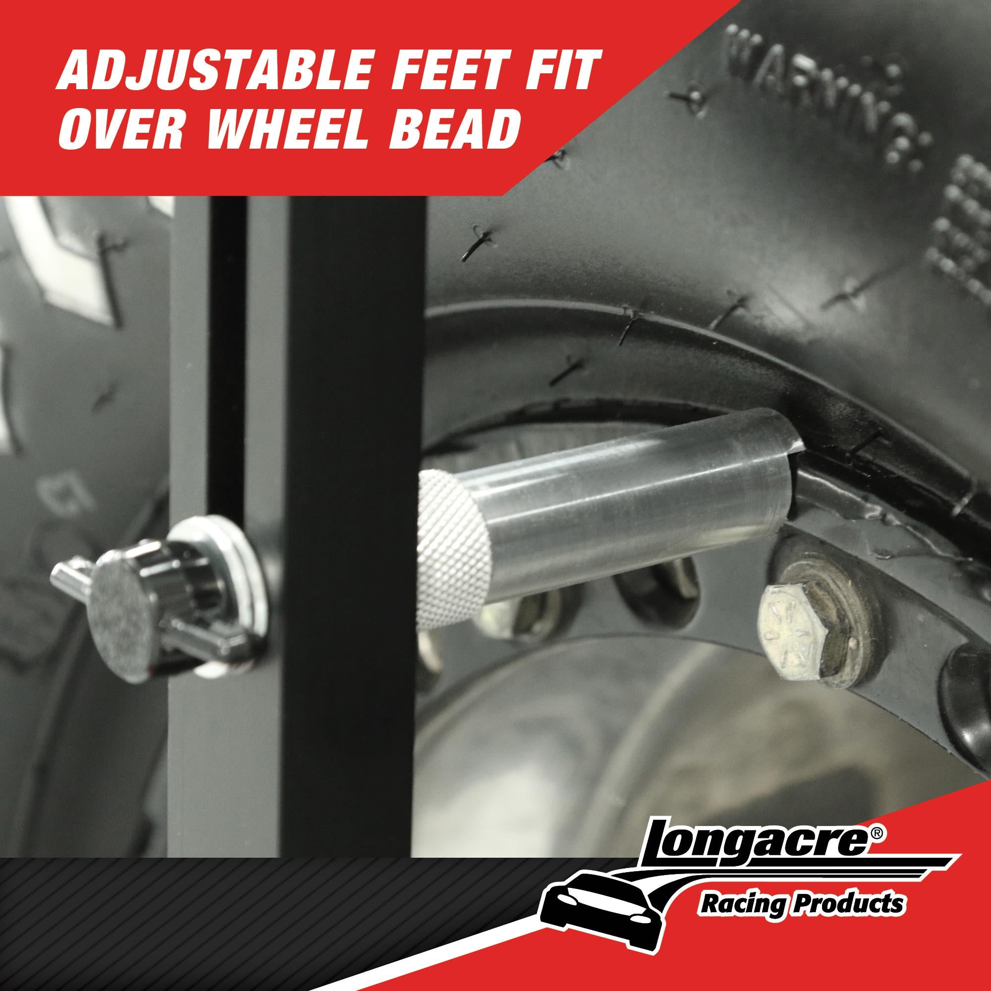 Works on most any race car, 13" to 24" aluminum , 'feet' adapt to wheel bead. 3 point design makes setting caster easier. Folds for easy storage.
