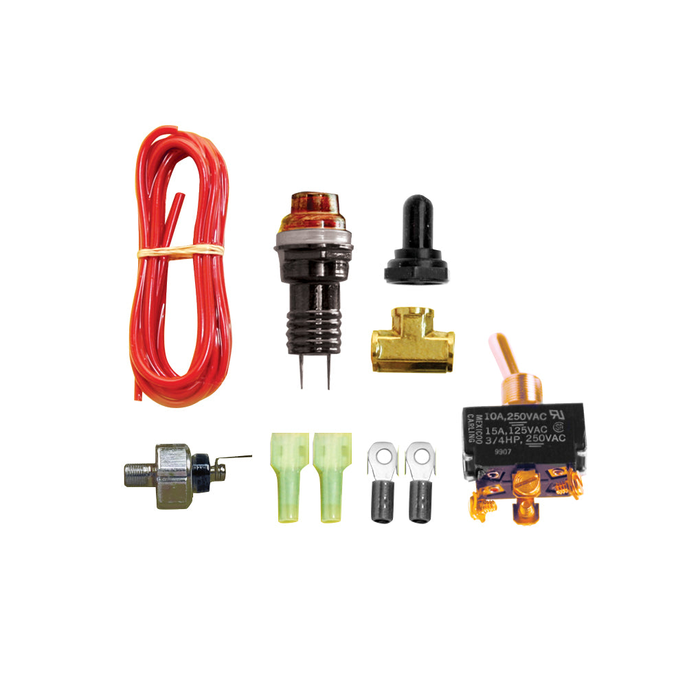 Includes holder for lightweight 9V battery, low oil pressure switch (20 psi), warning light, heavy duty polymer coated weatherproof switch , wire and terminals.