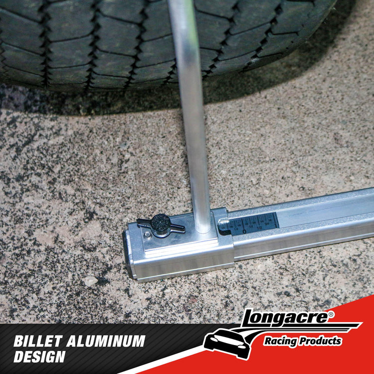 To get a very accurate toe measurement jack up front wheels and scribe a true running line on the face of the tire. Place the gauge in front of the tires and align the pointers with the scribe lines. Then move the gauge to the rear of the tires and align the fixed end with the scribe line. On the other end loosen the thumb screws and move the slider until the pointer aligns with the other scribe line. Now read the exact toe-in on the scale. Quick, easy, & accurate. A reminder… The scribed line can be anywhere on the tire face.